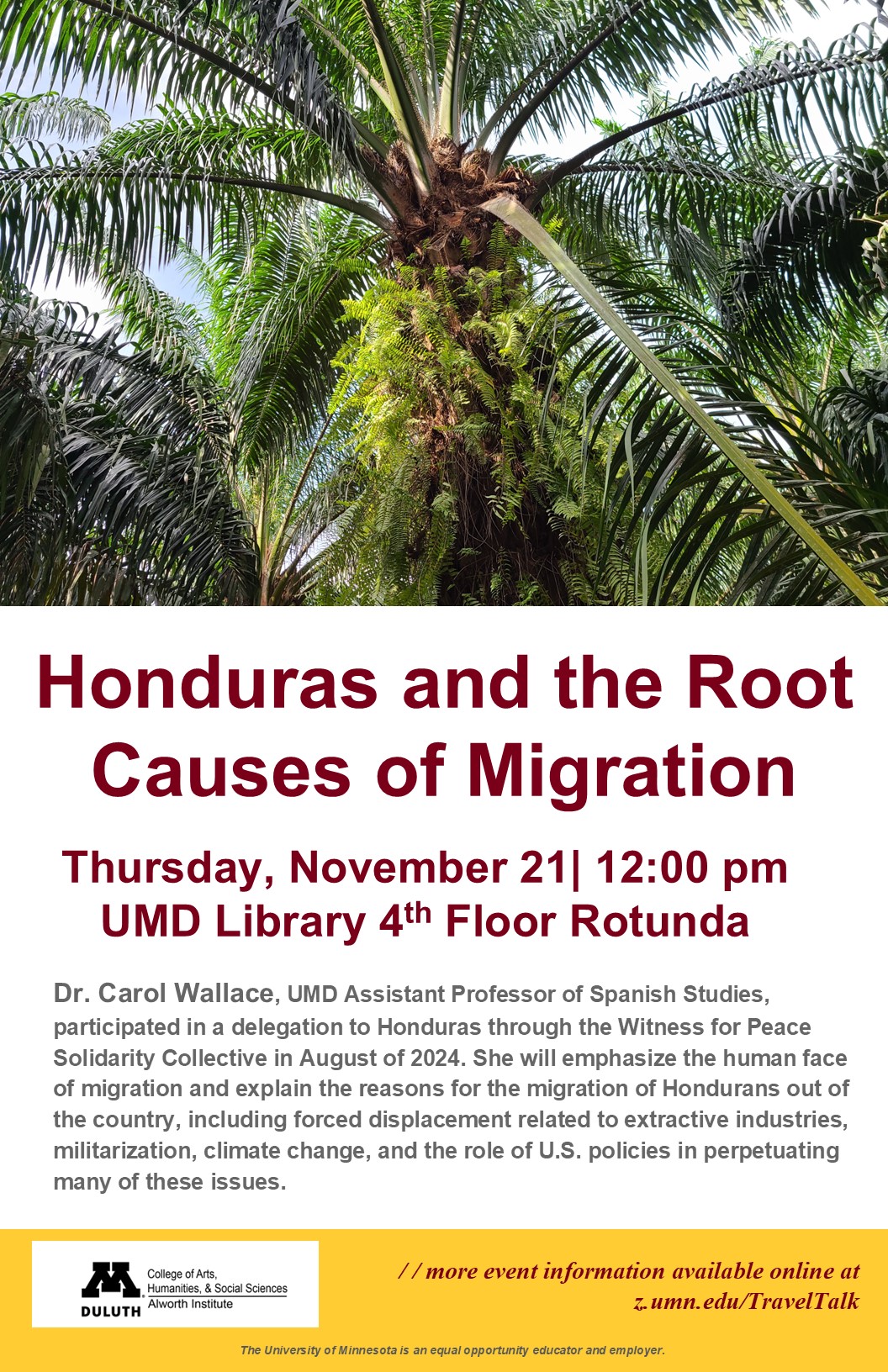 Wallace, Carol; University of Minnesota Duluth. Royal D. Alworth, Jr. Institute for International Studies. (2024). Honduras and the Root Causes of Migration (2024-11-21). Retrieved from the University Digital Conservancy, https://hdl.handle.net/11299/272171.